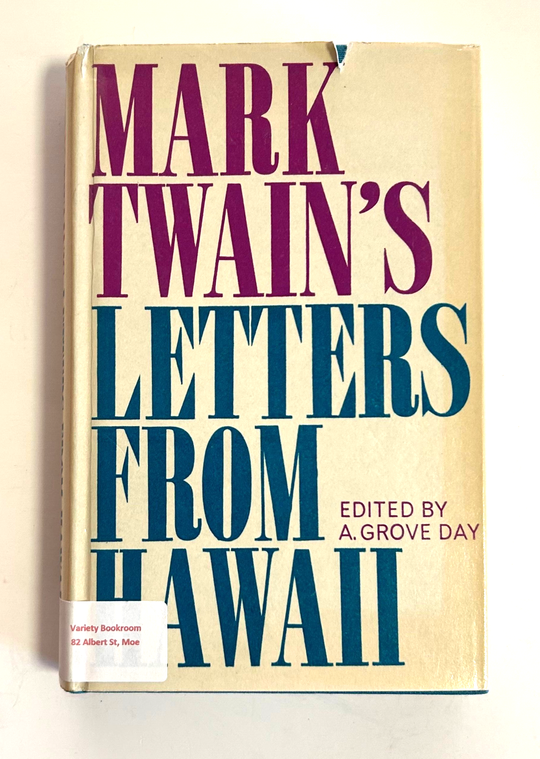 “In 1866 the young Mark Twain visited the Sandwich Islands as a roving reporter, and the series of twenty-five letters he contributed between March and June of that year … are among his earliest writings. The ‘Islands of the Blessed’ were to haunt Mark Twain for the rest of his life, for even when he came to write A Yankee at the Court of King Arthur in 1889, it was upon his recollections of the feudal Polynesian society that he drew.” 14 x 22 cm hardcover with almost intact dust jacket, 298 pages, excellent condition except for some tape marks on the first and last pages and a scrawled insciption inside the front cover.