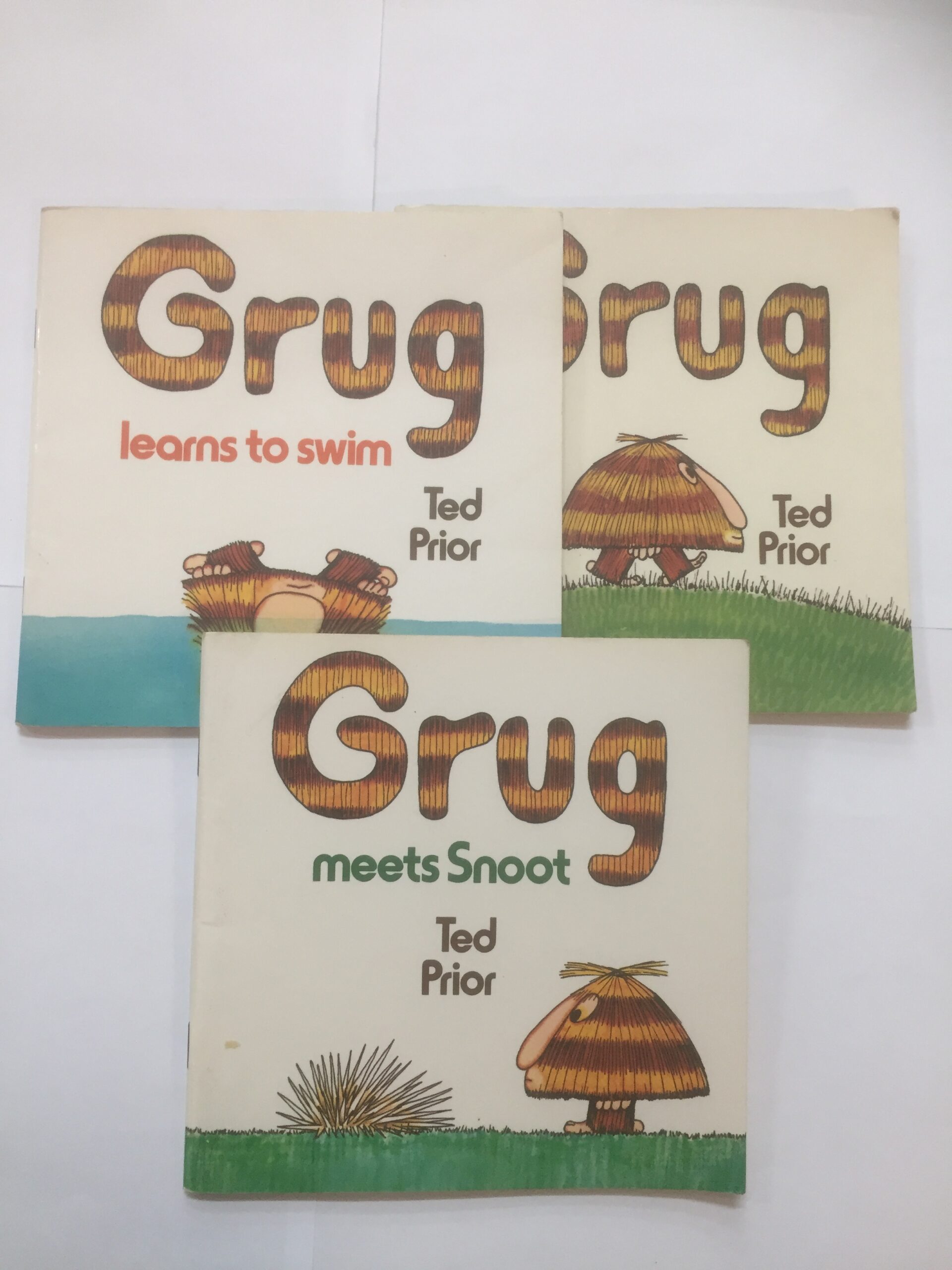 Three Grug books by Ted Prior: Grug, Grug Meets Snoot, and Grug Learns to Swim.